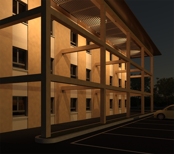 Durch das Rendern eines Bilds soll oft die Wirkung der Beleuchtung auf das Gebäudemodell überprüft werden. Angenommen, Sie möchten die Fassade eines Gebäudes gleichmäßig beleuchten. Nachdem Sie Leuchten platziert haben, möchten Sie sicherstellen, dass die Beleuchtung das gewünschte Resultat liefert.