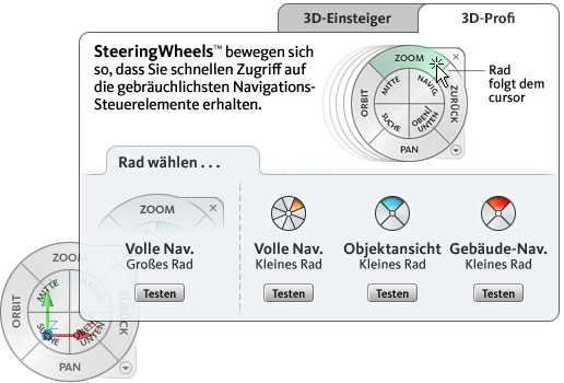 SteeringWheels sind Schnellauswahlmenüs (die Ihrem Cursor folgen), über die Sie mit einem einzelnen Werkzeug auf verschiedene 2D- und 3D-Navigationshilfen zugreifen können.