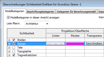 Der Großteil der Überschreibungen bei Sichtbarkeit und grafischer Darstellung erfolgt im Dialogfeld Sichtbarkeit/Grafiken. Ausgenommen davon sind Überschreibungen bei einzelnen Elementen. Diese werden im Dialogfeld Ansichtsspezifische Elementgrafiken vorgenommen.