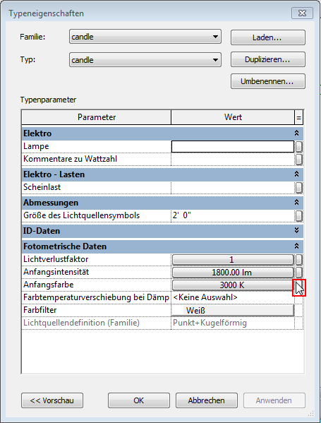 - Wählen Sie die Lichtquellenfamilie aus der Typenwahl.