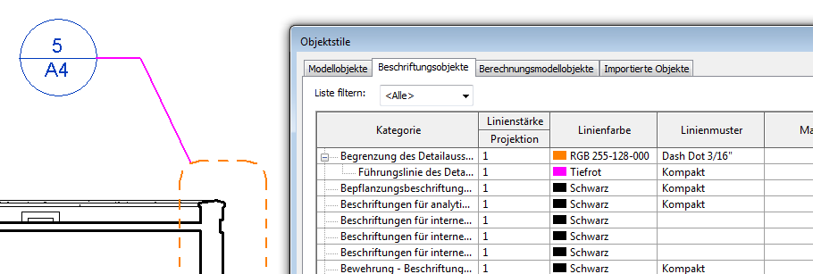 Sie können Linienstärke, Farbe und das Muster von Detailausschnittsbeschriftungsblöcken und Führungslinien ändern. Die hier angegebenen Einstellungen gelten für alle Detailausschnitte des Projekts.