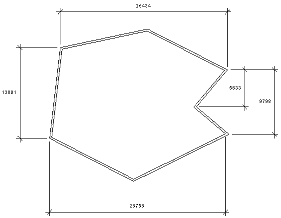 Die folgende Abbildung zeigt horizontale und vertikale lineare Bemaßungen an einem unregelmäßig geformten Gebäude.