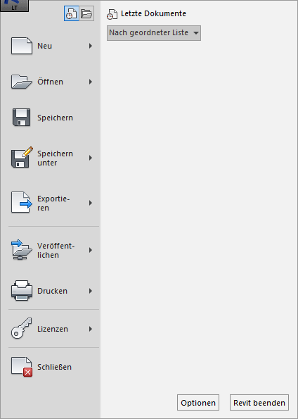 Klicken Sie im Menü-Browser auf die Schaltfläche Zuletzt verwendete Dokumente, um eine Liste der zuletzt geöffneten Dateien anzuzeigen. Verwenden Sie die Dropdown-Liste, um die Sortierreihenfolge von Zuletzt verwendete Dokumente zu ändern. Die Reißzwecken bewirken, dass Dokumente dauerhaft in der Liste bleiben, unabhängig davon, wie lange ihre Verwendung zurückliegt.