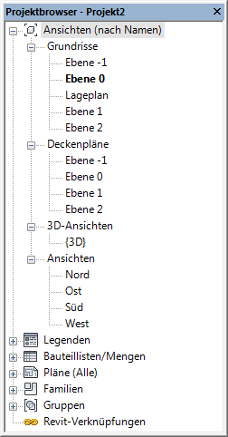 Der Projektbrowser zeigt eine logische Hierarchie für alle Ansichten, Bauteillisten, Pläne, Gruppen und andere Bestandteile des aktuellen Projekts an. Die Ordner können erweitert werden, um ihre untergeordneten Elemente anzuzeigen.