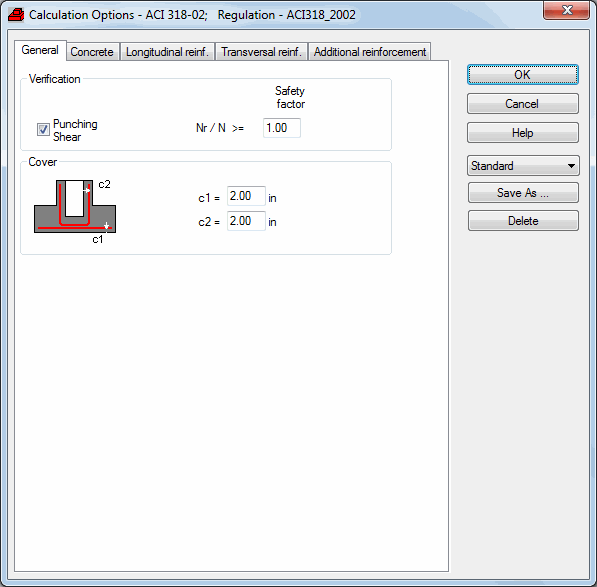 Once the Calculation Options dialog box for foundations is opened and the General tab is selected, the dialog box shown below will appear on the screen.