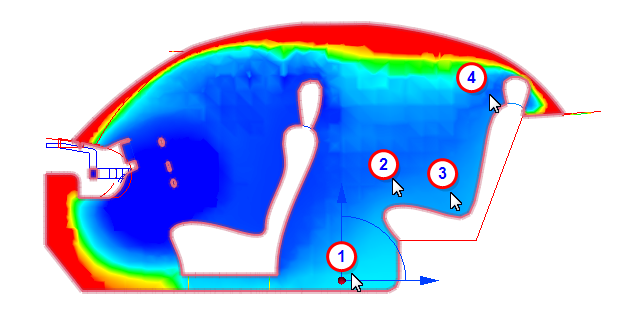 11. Halten Sie die UMSCHALTTASTE gedrückt, während Sie den Mauszeiger über die Ebene bewegen. Die Temperaturwerte werden in der Statusleiste unten links auf der Benutzeroberfläche angezeigt. Tasten Sie die Werte ab, und zwar in der Nähe der Füße, Knie, Hüften und Köpfe der Insassen auf den Vorder- und Rücksitzen.
