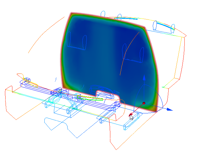 4. Drehen Sie die Ergebnisebene, indem Sie die Maus über den unten abgebildeten Triaden-Bogen ziehen. Untersuchen Sie mit dieser Methode die Temperaturverteilung überall im Fahrgastraum.