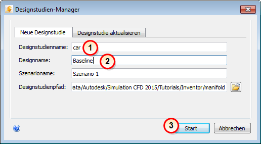 3. Weisen Sie im Designstudien-Manager der Designstudie, dem Design und dem Szenario einen Namen zu.