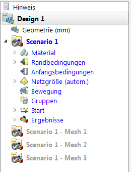 Eine Designstudie enthält mindestens ein Design (bestimmte CAD-Geometrie) und ein Design enthält mindestens ein Szenario (Sammlung von Materialien, Randbedingungen und Netzeinstellungen sowie zugehörige Analyseergebnisse). Designs werden in fetten, schwarzen Buchstaben und Szenarios in fetten, blauen Buchstaben dargestellt. Die Konfigurationszuweisungen und Ergebnisse werden in blauen Buchstaben in einem Szenario aufgelistet. Verwalten Sie die Analysen in diesem Fenster.