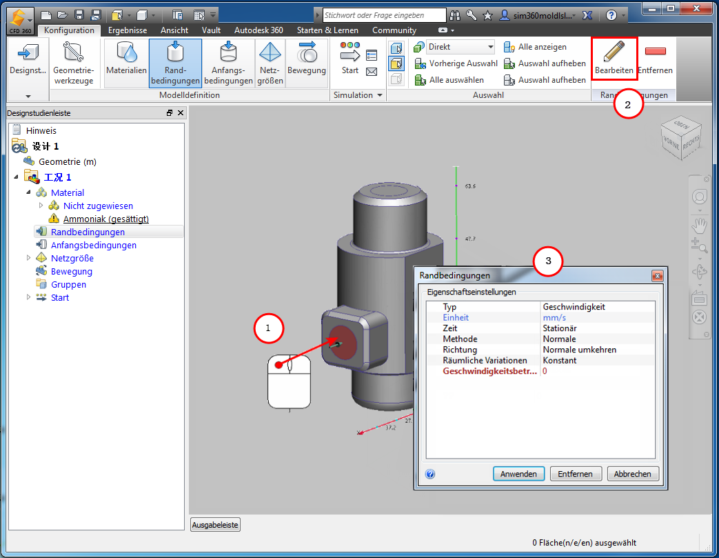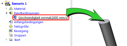 - Wenn als Richtung aus dem Modell heraus definiert wurde, kann auf einen Auslass eine Geschwindigkeit angewendet werden.