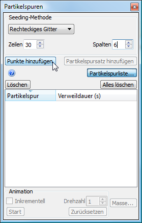 18. Wählen Sie im Dialogfeld Partikelspuren Rechteckiges Gitter als Seeding-Methode. Geben Sie 30 für Zeilen und 6 für Spalten ein. Klicken Sie auf Punkte hinzufügen.
