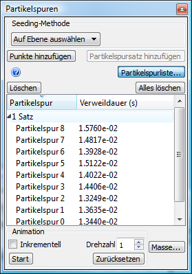 - Wenn eine Partikelspur sehr langsam animiert wird, führt sie möglicherweise durch einen Stagnationsbereich. Wenn die Spuren nach Verweilsdauer sortiert sind, klicken Sie auf die Partikelspur mit der längsten Verweildauer und dann auf die Schaltfläche Löschen.