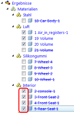 7. Aktivieren Sie zur Schattierung der Karosserie das Kontrollkästchen neben dem Teil Karosserie unter der Verzweigung Stahl der Verzweigung Ergebnisse > Material. Klicken Sie mit der rechten Maustaste auf den ausgewählten Teilenamen, und wählen Sie Schattiert aus.