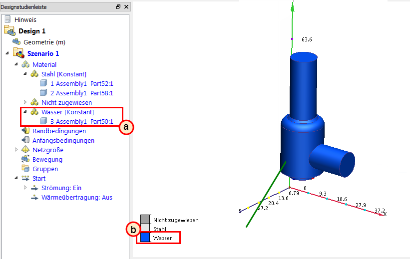 6. In der Designstudienleiste können Sie anhand der Teilfarbe überprüfen, ob das Material Wasser korrekt zugewiesen wurde: