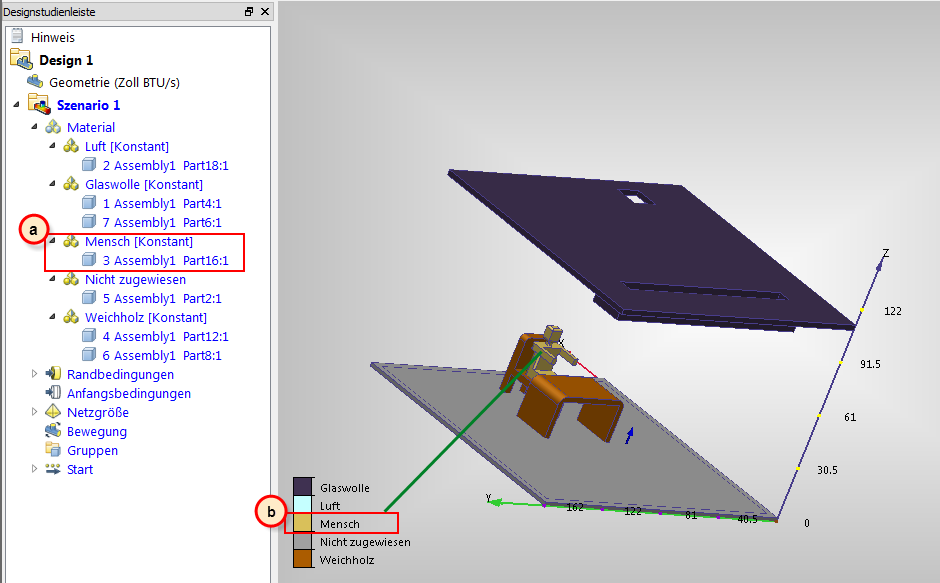 a. Überprüfen Sie in der Designstudienleiste, ob die Materialzuweisung für Mensch korrekt ist.