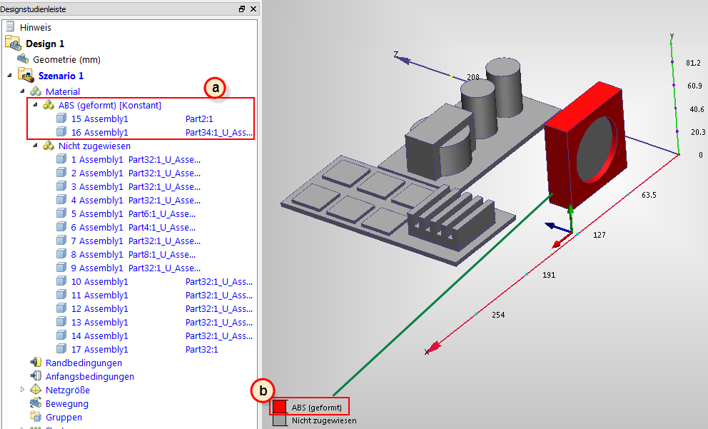 a. Überprüfen Sie in der Designstudienleiste, ob die Materialzuweisung für die ABS (geformt)-Teile korrekt ist.