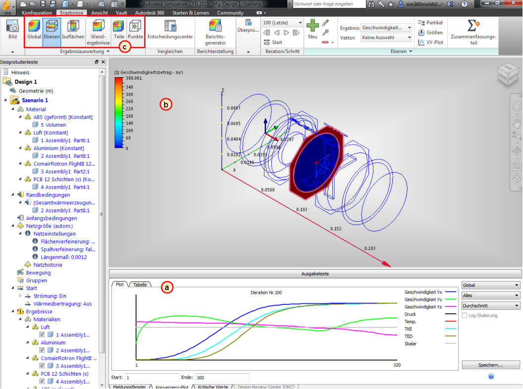 a. Der Konvergenz-Plot zeigt die Berechnungsbedingung während der Simulation. Wenn die Linien flach auslaufen, ändert sich die Lösung nicht mehr, und die Simulation ist abgeschlossen.