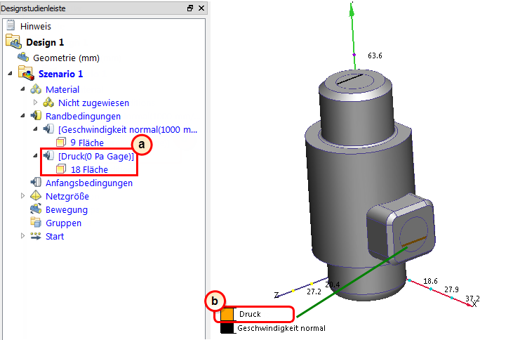 6. Um zu überprüfen, ob die Randbedingung korrekt auf den Auslass angewendet wurde, überprüfen Sie die Designstudienleiste und den Farbstreifen auf der Auslassfläche:
