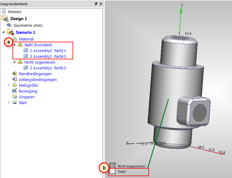 a. Überprüfen Sie in der Designstudienleiste, ob die Materialzuweisung für die beiden Stahlteile korrekt ist.