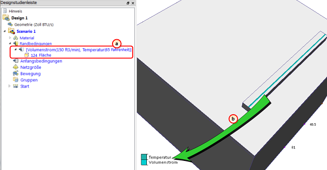 14. Um zu überprüfen, ob die beiden Randbedingungen korrekt angewendet wurden, überprüfen Sie die Designstudienleiste und die Farbstreifen auf der Zuleitungsfläche: