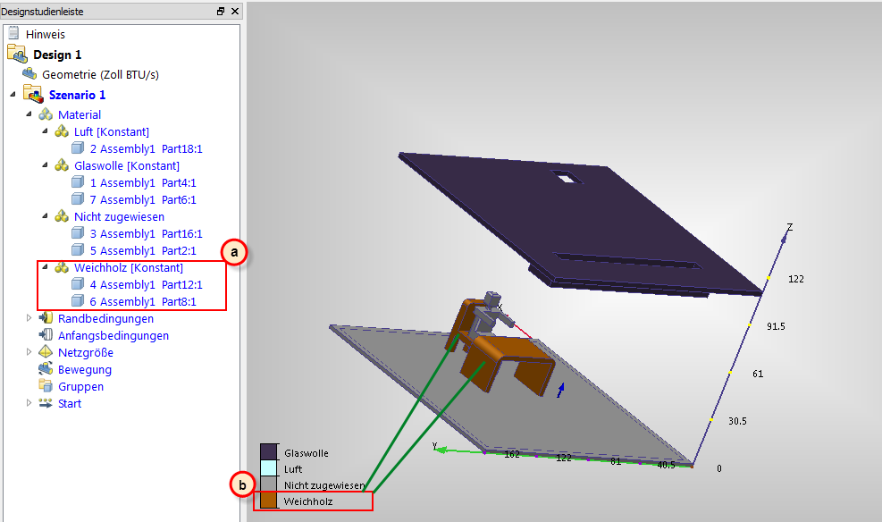 a. Überprüfen Sie in der Designstudienleiste, ob die Materialzuweisung für Weichholz korrekt ist.