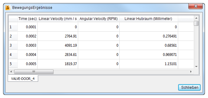 In diesem Schritt wird der zeitliche Verlauf der Verschiebung und Kraft für den Teller mithilfe der Bewegungsergebnistabelle bestimmt. Diese Tabelle enthält den vollständigen Verlauf von Geschwindigkeit, Verschiebung, Kraft und Drehmoment des beweglichen Festkörpers.