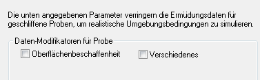 Normalerweise werden spannungs- und dehnungsbasierte Materialdaten zuvor gemessen, indem Exemplare mit einer standardmäßigen Größe und Temperatur und einer vorgegebenen polierten Oberfläche verwendet werden. Wenn die Bedingungen bei einer realen technischen Komponente nicht den idealen Bedingungen entsprechen, verwenden Sie die Faktorisierung der Materialieneigenschaften (von der Prüfung).