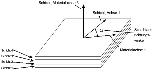 Die Tabelle Komposite-Laminatstapelsequenz kann verwendet werden, um die Verbundwerkstoff-Schichten zu definieren. Die Layer werden wie unten im Abschnitt Steuern der Ausrichtung von Gehäuseelementen beschrieben ausgerichtet und sortiert. Die Spalte Dicke muss für jeden Layer definiert werden. Die Spalte Ausrichtungswinkel gibt den Winkel α zwischen den Materialachsen (definiert auf der Registerkarte Ausrichtung) und den Faser- oder Layerachsen an. Die Materialeigenschaften werden entsprechend der Schichtachsen eingegeben. Klicken Sie zum Definieren der Materialeigenschaften für einen Layer in die Spalte Material. Ein Dialogfeld wird angezeigt, in dem Sie ein vorhandenes Material auswählen oder ein neues Material Hinzufügen können. (Weitere Informationen finden Sie auf der Seite Einrichten und Durchführen der Analyse: Nichtlinear: Materialeigenschaften: Verbundwerkstoff-Materialeigenschaften.)