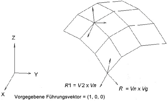 Die Drehungsrichtungen R1 und R2 an jedem Knoten werden durch das Kreuzprodukt des Normalenvektors Vn und eines Führungsvektors Vg wie folgt bestimmt. Siehe Abbildung 3 (V1 und V2 sind die Einheitsvektoren entlang der Drehrichtungen R1 und R2):