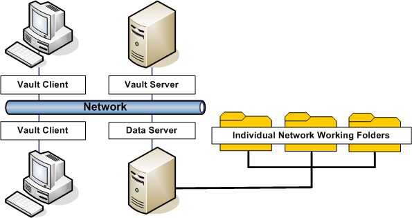 When working folders are kept on local computers, as shown in figure 7, it minimizes network traffic and accommodates team members who may work offline from the field or a home office. Users create network traffic only when they check files in or out from the vault.