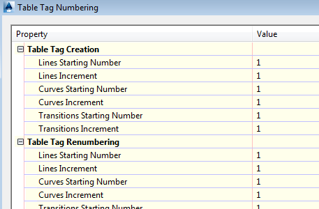 In AutoCAD Civil 3D, table tag control is maintained through the Toolspace Settings tab. While in Master View, right-click the drawing name and select Table Tag Numbering.