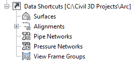 Data shortcuts can be created only for surfaces, alignments, profiles, pipe networks, pressure networks, and view frame groups. They provide reference links between drawings without the use of a database. When you create data shortcuts from a drawing, they appear on the Data Shortcuts node of the Prospector tree. From this location, you can insert a reference object into another open drawing by right-clicking its shortcut.