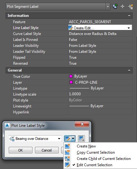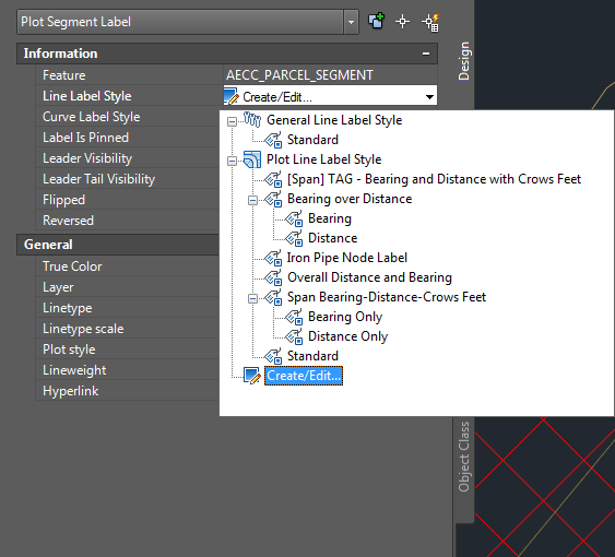 From the styles pull-down menu in the Properties palette, select Create/Edit (as shown in figure 13) to access the Object (Plot Line Label) Style dialog box as shown in figure 14.