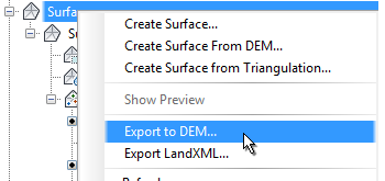 AutoCAD Civil 3D enables you to export DGM files from a surface. At the time of export, you can expand the grid spacing to make the file smaller. Figure 3 shows the menu selection used to start the export process.