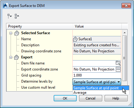 An important export setting is the method for determining level at each point. You can choose to either sample the surface level at the grid point, or compute the average level from surrounding points. The latter method (averaging) is more time consuming. For greater efficiency, use the surface sampling option, as shown in figure 4.