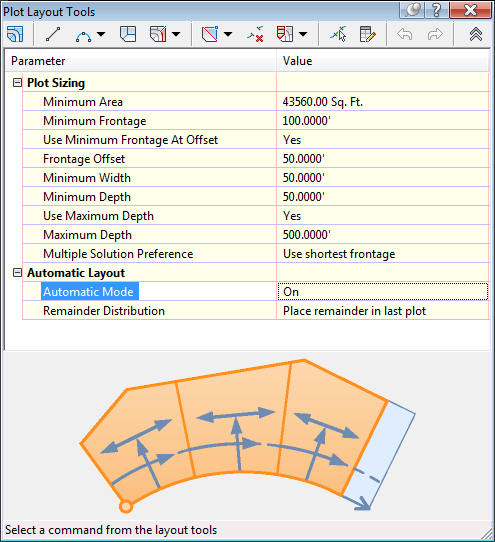 You can use the additional parameters, such as frontage offset, minimum width and depth for even greater precision when you initially lay out the plots. The plot sizing parameters allow for a continuous workflow. If you reject a proposed solution, you can simply adjust the parameters and the preview graphics update dynamically.