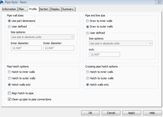 Use the Clean Up Pipe To Pipe Connections option in the Pipe Style dialog box, as shown in figure 4, to improve the appearance of pipe profiles so that the pipes graphically appear to line up as expected. This option is not enabled by the default, so you must select it.