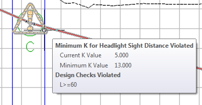 The curve still does not meet the minimum K value for overtaking sight distance, so the warning symbols are displayed. To clear a warning symbol, the element must meet all values specified in both the design criteria file and the applicable design checks.