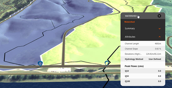- A single analysis may identify multiple watersheds. Each watershed is a selectable feature. Click inside one to display its asset card.