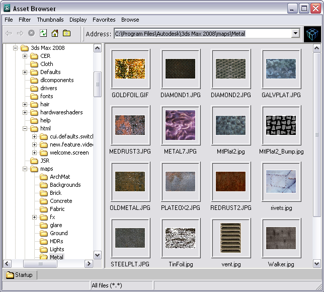 Displays thumbnails of all images stored in your cache directory. When turned on, the left pane displaying the directory tree goes away, and the thumbnails you see might be in various directories. Because the thumbnails point to the correct directories, you can still use them to access the files and display or drag them to areas in the 3ds Max user interface.