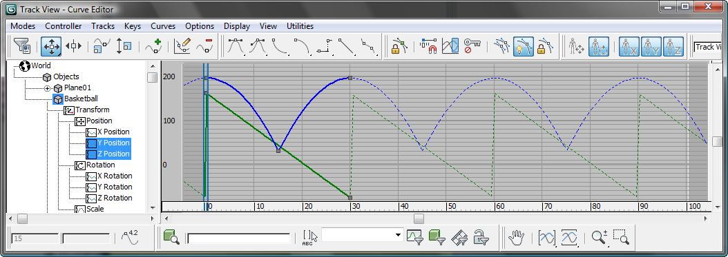 Now the ball bounces as before, but at each continuation of the bounce, the forward motion begins where it ended. You can see the difference in the Curve Editor, if you zoom out in the curve window: The Z Position track goes up and down, but the Y Position track continues in a straight line.