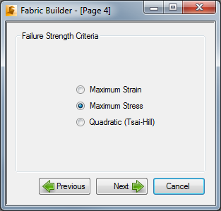 Three failure criteria options including Max Stress, Max Strain, and Tsai-Hill can be selected on Page 4. The selected failure criteria will be used to run a progressive failure survey on a laminate representing a random continuous mat. The strength of the representative laminate is calculated using the selected failure criteria. Selecting a failure criterion and clicking Next will bring you to Page 5 as shown below.