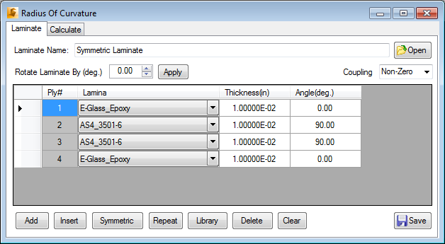- Laminate - Define the laminate that will be used in the calculator. The laminate can be defined in either of two ways: