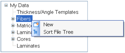 - New - Create a new thickness/angle template, material, or laminate data file that will be added to the material database. When using this option, you must explicitly specify all parameters needed to define the new thickness/angle template, material, or laminate. This option can be accessed by right-clicking on a particular branch within the file tree and selecting New. The image below shows the New option being accessed to create a new Fiber material data file.