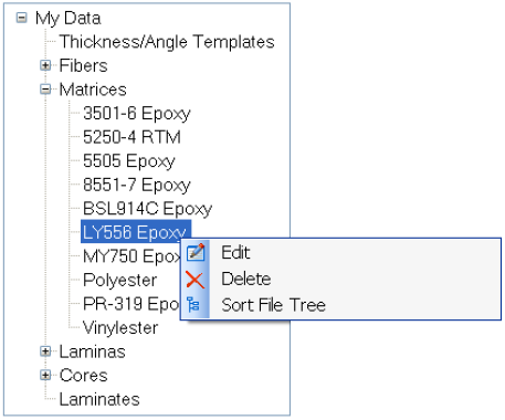 - Edit - Edit any of the material data files or thickness/angle templates that appear in the material data file tree. Right-click a particular material data file or thickness/angle template that appears in the material data file tree and select Edit to access this option. The image below shows the options available after right-clicking the Epoxy material data file that appears on the Matrices branch.