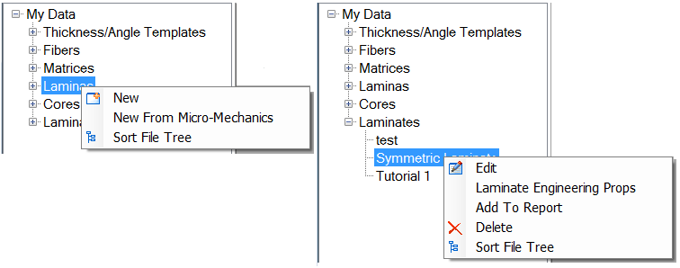 - New From Micro-Mechanics - Create a new Lamina material by using micro-mechanics to define the lamina properties resulting from a combination of fiber and matrix materials stored in the material database. This option is accessed by right-clicking on the Laminas branch and selecting the option New From Micro-Mechanics (see below).