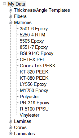 See Appendix B for a complete list of the pre-defined materials stored in the material database. Existing materials can be selected, edited, or deleted. In addition, new materials can be created and added to the material database. The material data file tree has six branches as shown in below. The six branches are Thickness/Angle Templates, Fibers, Matrices, Laminas, Cores, and Laminates.