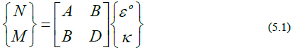 In Classical Laminate Theory, the [A], [B], and [D] matrices collectively form the laminate stiffness matrix. The laminate stiffness matrix is used to express laminate resultant forces per unit width {N} and laminate resultant moments per unit width {M} in terms of laminate mid-plane strains {e 0 } and laminate mid-plane curvatures {k}. This is shown in Eq. 5.1.