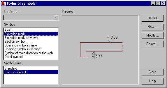 - New - click this to open a dialog (Axis , Section symbol, Opening symbol in view, Opening symbol in cross-section, Symbol of main direction of the slab, Detail symbol or Elevation marks on plans/Elevation mark) where you can define a new style of the selected symbol type (based on the existing style).