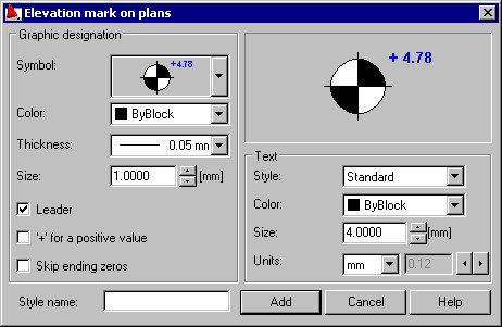 Leader - if you select this, the drawing will include a line that connects the ordinate with the elevation symbol on plans. It is active only for the symbols for which the describing the ordinate is beyond the symbol.